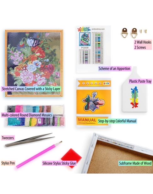 Stretched Canvas covered with sticky layer, subframe made from wood, scheme of an apportion, walls hooks and screws, Manual, plastic tray, rhinestones different color , tweezers, stylus pen, silicone stylus sticky glue.