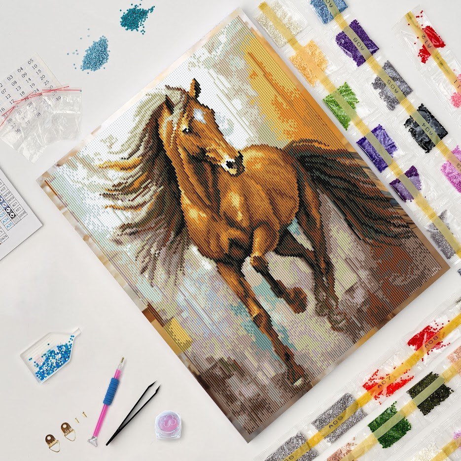 Stretched Canvas covered with sticky layer, subframe made from wood, scheme of an apportion, walls hooks and screws, Manual, plastic tray, rhinestones different color, tweezers, stylus pen, silicone stylus sticky glue.
