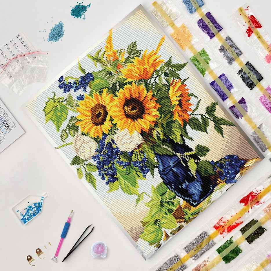 Stretched Canvas covered with sticky layer, subframe made from wood, scheme of an apportion, walls hooks and screws, Manual, plastic tray, rhinestones different color, tweezers, stylus pen, silicone stylus sticky glue.