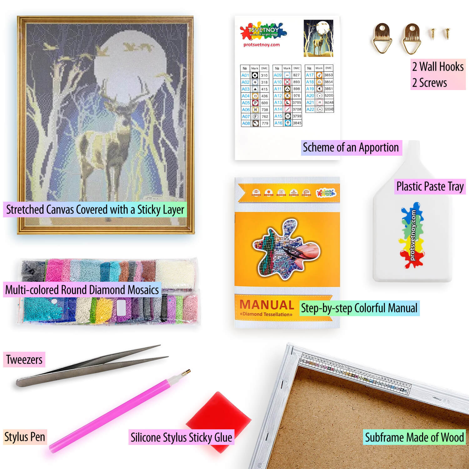 Stretched Canvas covered with sticky layer, subframe made from wood, scheme of an apportion, walls hooks and screws, Manual, plastic tray, rhinestones different color, tweezers, stylus pen, silicone stylus sticky glue.