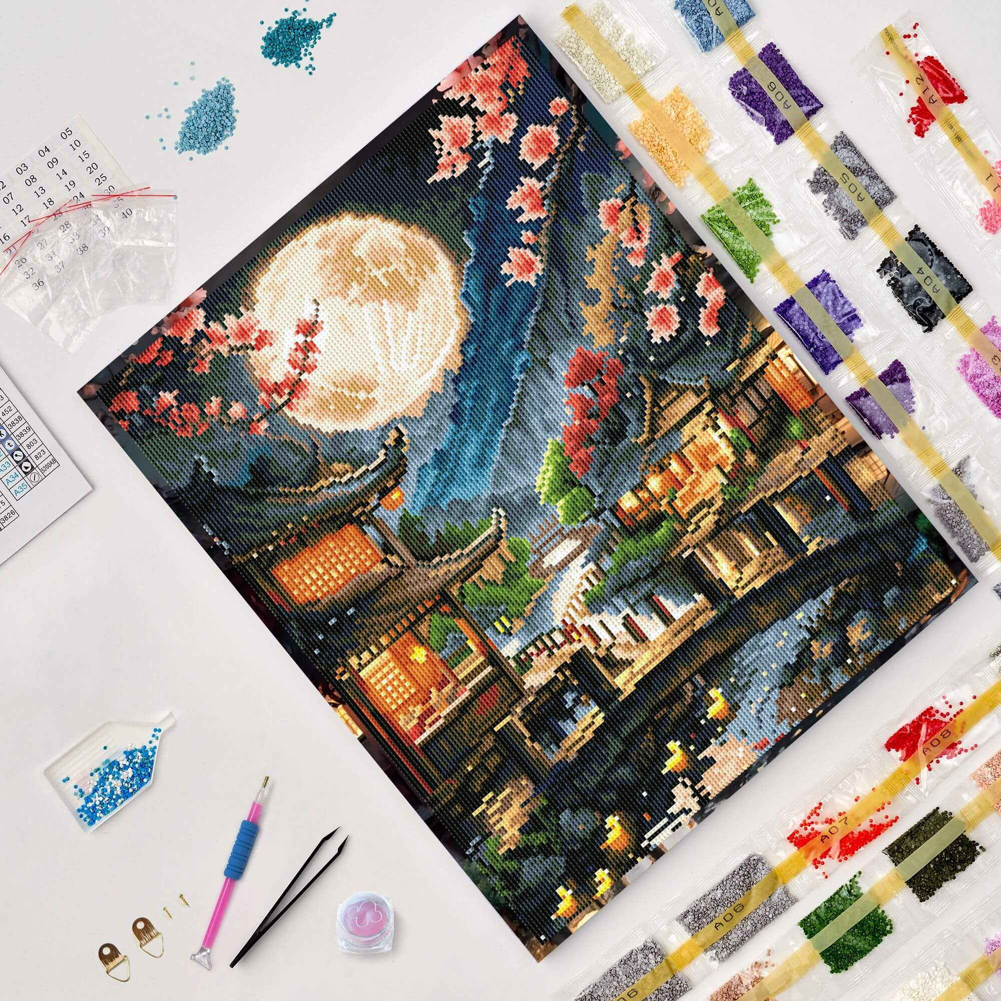 Stretched Canvas covered with sticky layer, subframe made from wood, scheme of an apportion, walls hooks and screws, Manual, plastic tray, rhinestones different color, tweezers, stylus pen, silicone stylus sticky glue.