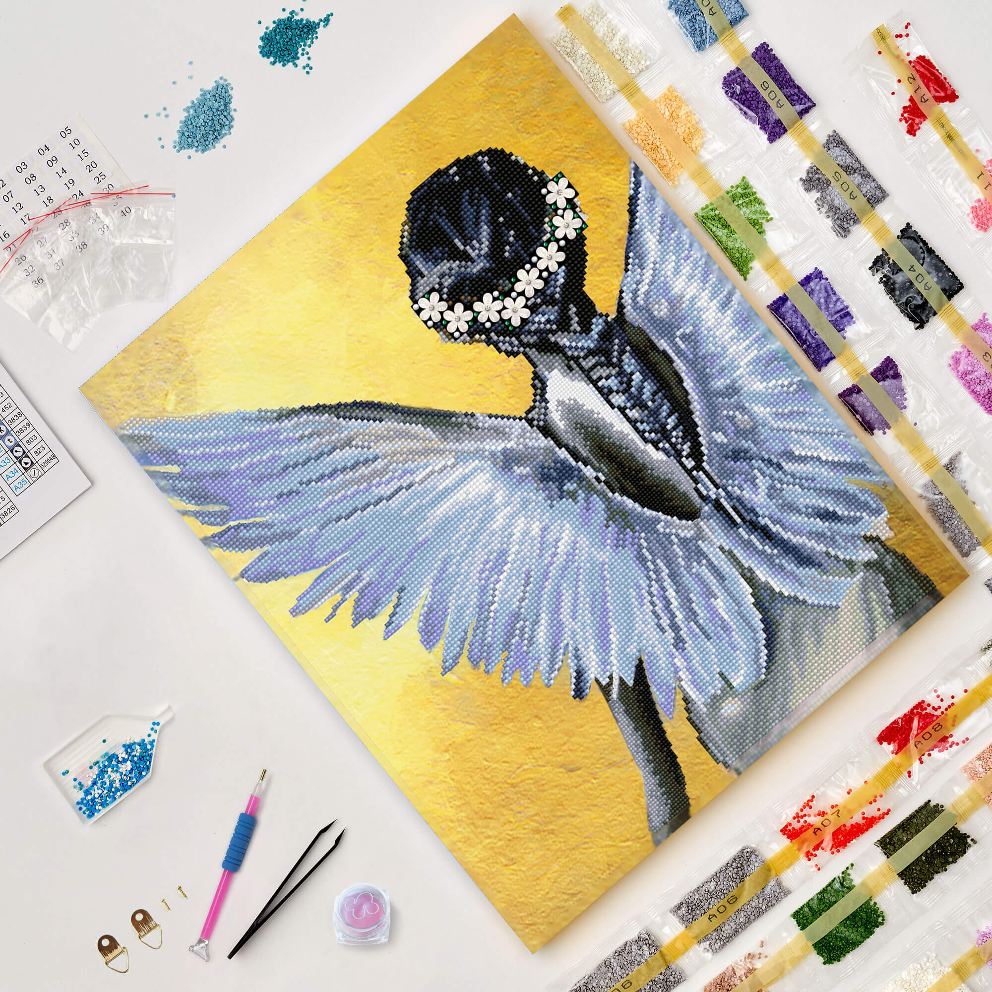 Stretched Canvas covered with sticky layer, subframe made from wood, scheme of an apportion, walls hooks and screws, Manual, plastic tray, rhinestones different color, tweezers, stylus pen, silicone stylus sticky glue.